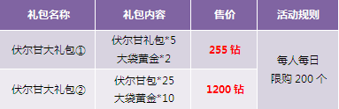 【活动内容】活动期间,伏尔甘礼包搭配大袋黄金特价出售,小伙伴们再也不用为神铸黄金不够发愁啦,赶快行动吧!