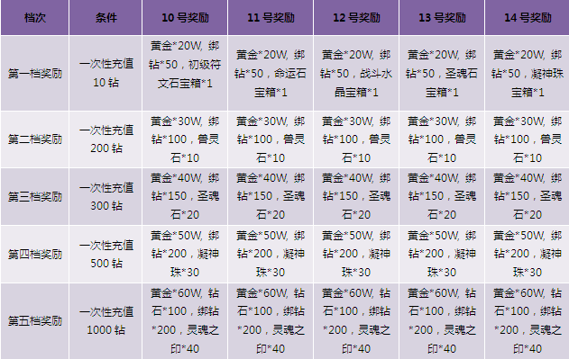 1. 每日首次充值10钻以上即可获得第一档奖励,领完本档奖励可充值参加下一档活动,第二次一次性充值200钻以上可以获得第二档奖励,以此类推,一次充值达到条件领取对应档礼包一份;