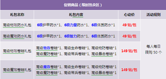 1. 优惠礼包在商城“限时热卖区”出售,限时热卖区域中的道具仅限“钻石”购买;