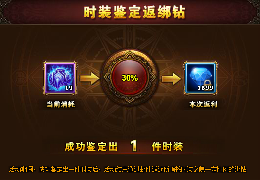 【活动内容】活动期间,为了众曲友轻松提战力,特别推出时装鉴定返利活动!成功鉴定任意时装即可获得鉴定消耗的钻石总和的30%,活动需满足以下2个条件:
