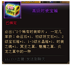 1. 购买高级时装宝箱、高级时装宝箱开出物品、活动兑换物品均为绑定;