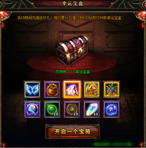 【活动内容】活动期间,累积充值500钻即可获得一个幸运宝盒。奖励内容挑战极限,样样值得拥有!