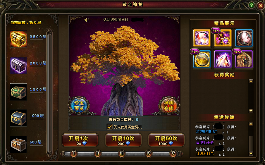 【活动说明】活动期间,单服所有玩家开启神树会累积神树层数,摇到指定层数的玩家可以额外获得一份超级大礼!个人消费奖励的重置时间为凌晨0点。