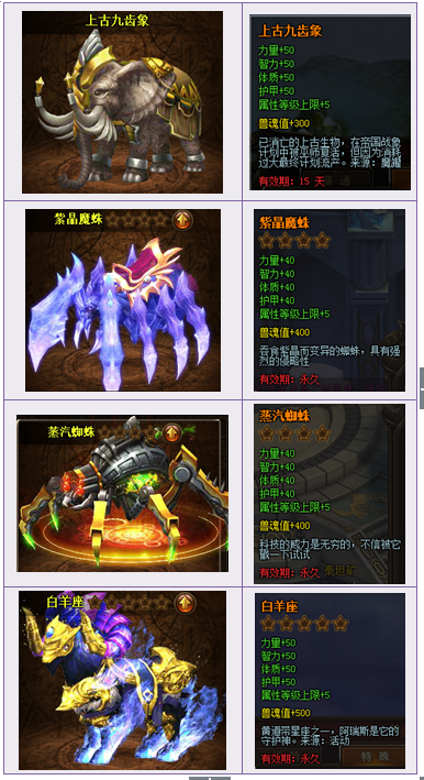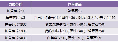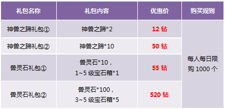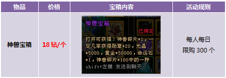 【活动内容】活动期间,商城上架神兽宝箱,18钻一个,收集一定数量的神兽碎片可以兑换各种稀有坐骑。