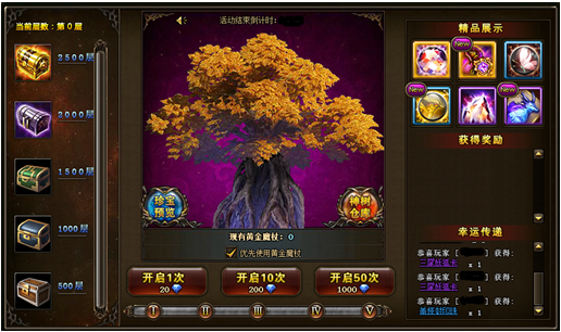 【活动说明】活动期间,单服所有玩家开启神树会累积神树层数,摇到指定层数的玩家可以额外获得一份超级大礼!个人消费奖励的重置时间为凌晨0点。