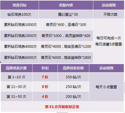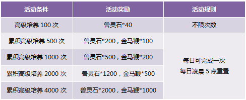 1.高级培养100次不限次数,累计高级培养至500次、1000次、2000次、4000次,每日可完成一次,活动次数每天凌晨5点重置,请留意领取奖励,奖励皆为绑定;