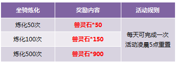 坐骑炼化活动每天五点重置。