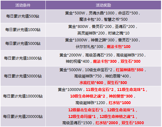 1. 每日累积充值达到1000钻石可同时获得累积充值1000和500档次的两重奖励,依此类推;