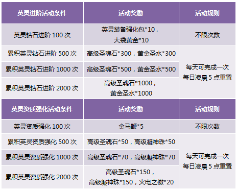 1、英灵资质强化100次,、英灵钻石进阶活动,可重复参加获得奖励;