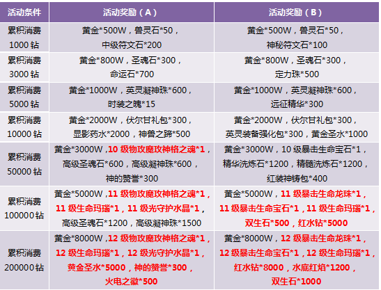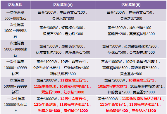 3. 活动期间累计消费满足条件可领取奖励,每重奖励玩家只能领取一次, 请留意领取活动奖励。