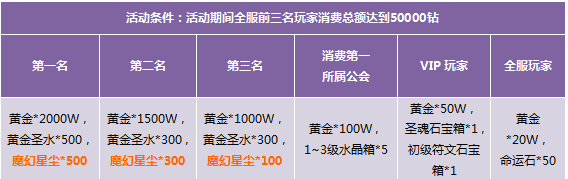 【活动内容】活动期间,单区前3名玩家消费总额达到5W钻,即可获得豪礼一份,消费第一名所在公会全员也可领取大礼一份。