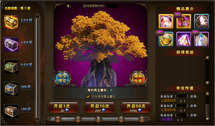 【活动说明】活动期间,单服所有玩家开启神树会累积神树层数,摇到指定层数的玩家可以额外获得一份超级大礼!个人消费奖励的重置时间为凌晨0点。