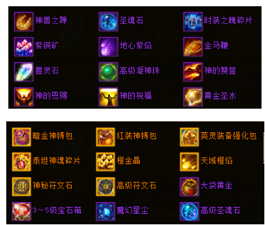 黄金*2000W,高级圣魂石*350,高级凝神珠*350, 神的恩赐*300,魔法卡包*300,双生石*300 |