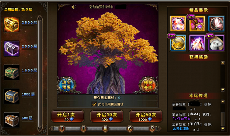 【活动说明】活动期间,单服所有玩家开启神树会累积神树层数,摇到指定层数的玩家可以额外获得一份超级大礼!个人消费奖励的重置时间为凌晨0点。