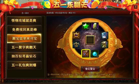 活动描述:五一活动7天时间内,每天可以从五一宝箱中抽取一个宝物,共抽取7次,坚持每天抽奖,则必中大奖:幻装神龙盘。