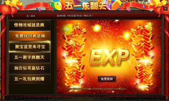 5月4号开始,恢复正常,经验只能找回3天,道具只能找回1天。免费找回一定比例,花钱才能全部找回。活动内容:五一期间3天,活动期间,免费找回全部经验和宝物,VIP找回也免费找回全部。
