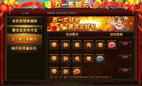 活动内容:做任务打副本击杀BOSS可以获得祝福字,集齐所需文字获得大量丰厚奖励。劳动:绿星石*2战马精魄*5铜钱2W
