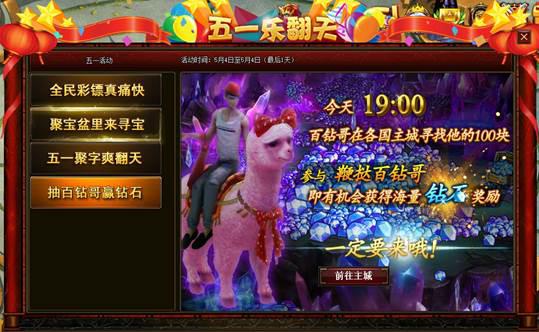 活动描述:活动期间,晚上19:00,百钻哥会出现在各国主城,参与鞭挞百钻哥即有机会获得海量钻石奖励。
