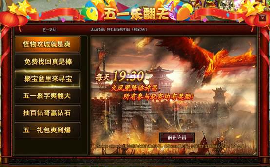 每天19:30-20:20活动内容:五一活动期间,火凤凰会带领火精攻打许昌,怪物一共有3波,每波刷新时间3分钟,一旦火凤凰被消灭则,所有参与战斗的玩家都会获得丰富奖励。