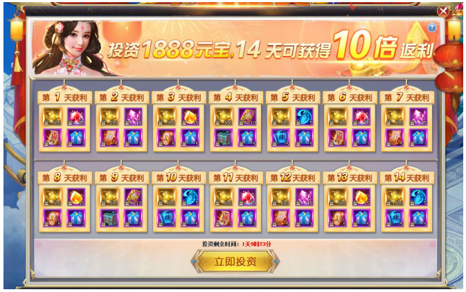 【活动内容】活动开启后,购买投资计划的玩家,可获得丰厚返利,10倍返还不讲理,海量绑元、炼器材料、进阶丹等你来拿,赶快参加把!