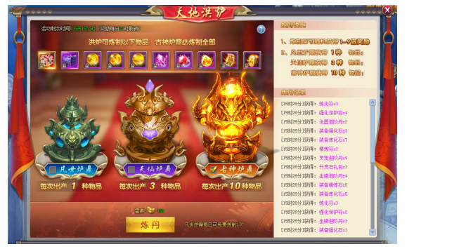 【活动内容】活动期间,玩家可选择三种不同的方法去炼制物品,每种炉鼎可以炼制出不同种类的道具,凡世炉鼎炼制1种物品,天仙炉鼎炼制3种物品,古神炉鼎炼制10种物品。每次炼制更有机会获得9倍数量道具,心动不如行动,999鲜花、高级宝石、海量进阶炼器材料等你来拿!