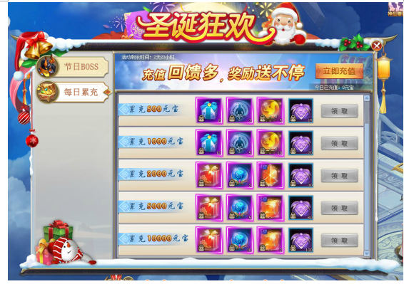 【活动内容】叮叮当叮叮当,铃儿响叮当。圣诞老人降临,天赐福利。在活动时间内,充值达到指定数额,即可获得丰厚的圣诞大礼一份。礼品内包含海量斩魄刀碎片,灵宠进阶丹礼包,幸运符和稀有属性宝石礼盒,更有法力拓容丹,玄武极御修炼丹等你拿!