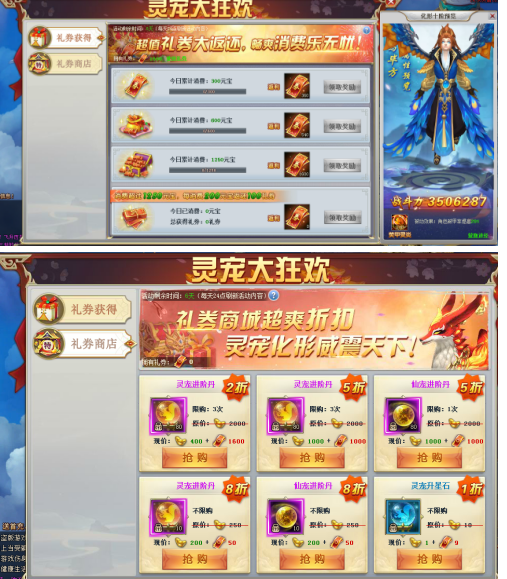 【活动内容】活动期间, 每日累积消费即可享受超值福利,返还超额的海量礼券,随后的消费也可获得高额礼券返还,礼券可用于礼券商店购买高折扣礼包,更有2折礼包在等你,心动不如行动,炫酷仙宠,强力仙宠技能等着你!