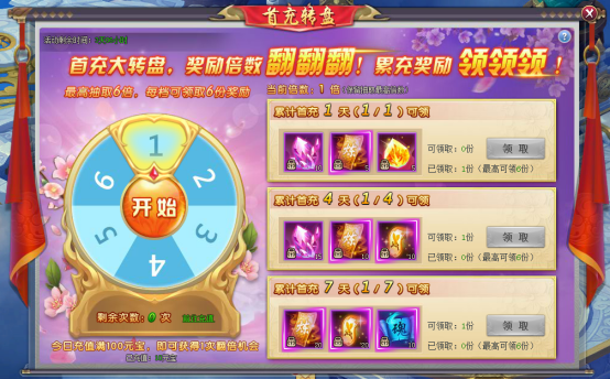 4. 若转动到更高倍数,则可领取剩余未领奖励,例如之前转动3倍,已领取累计首充1天奖励3份,当前转动到6倍,即可再领取累计首充1天奖励3份