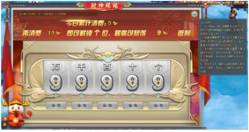 【活动内容】活动期间,玩家每日消费最低10元宝即可开启幸运财神赐福!根据玩家每日消费元宝返还高额比例绑定元宝,最高可获得99999绑定元宝哦!财神赐福不讲理,岁岁月月共发财,赶快来参加把!