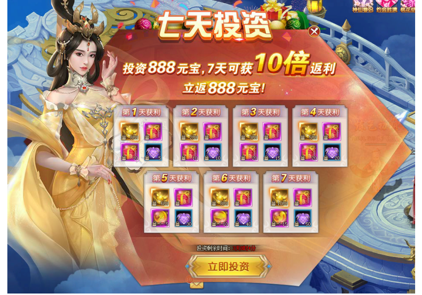 2. 购买投资计划的玩家可每日领取返利直至领取完毕活动结束