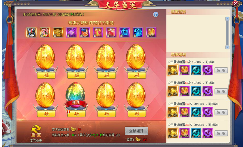 【活动内容】活动期间,玩家可以在活动界面砸金蛋,赢好礼,各种珍贵道具收纳囊中!更有机会砸到七彩金蛋,获取神秘好礼!新版时装、海量进阶材料、斩魄刀礼包、999鲜花、各类装备材料海量产出,时不我待,快来参加把!
