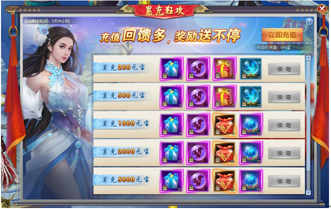 【活动内容】活动时间内,充值达到指定数额,即可获得丰厚的充值大礼一份。礼品内包含海量进阶丹、法力拓容丹等精美道具,海量福利等你拿!