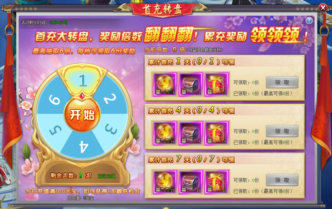 4. 若转动到更高倍数,则可领取剩余未领奖励,例如之前转动3倍,已领取累计首充1天奖励3份,当前转动到6倍,即可再领取累计首充1天奖励3份