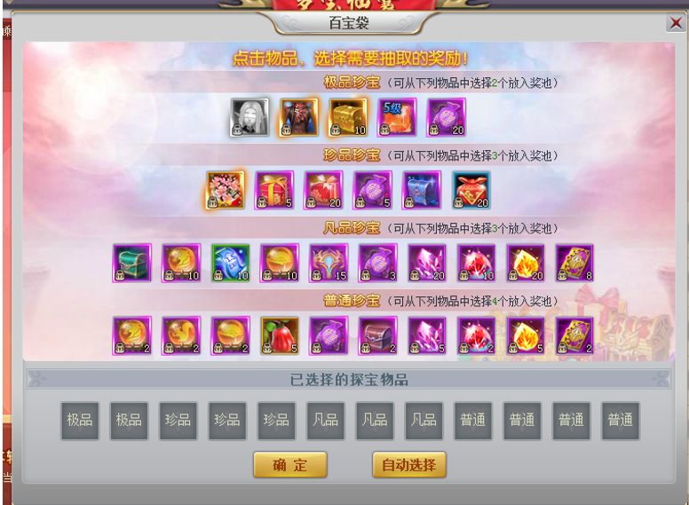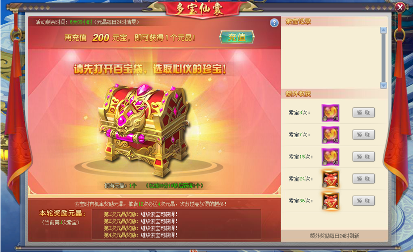 【活动内容】珍奇百袋任你挑,心仪珍品送不停。活动期间,玩家可打开仙囊选择自己心仪的宝物进行探宝,玩家每充值200元宝即可获得1元晶,每日在线一定时间更有免费元晶赠送!累计相应数量的元晶即可进行探宝,探宝时更有几率奖励高额元晶祝您一臂之力!还在等什么,您想要的,任您挑选!