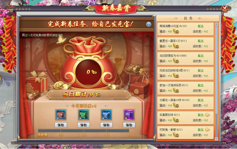 【活动内容】喜迎新春,福利放送。2月8日至2月21日期间,每日完成指定任务即可获得活跃值以及增加福袋一定数量的绑元,每日活跃度达到指定数额即可免费获得丰厚奖励。2月22日至2月28日玩家每日登录即可免费获得福袋中一定比例的绑定元宝直至全部领完。