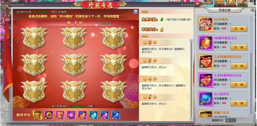 【活动内容】活动期间,玩家每日可获得3次免费翻牌机会,也可在商城购买抽奖券进行额外翻牌,每次翻牌都有机会获得不同数额的积分奖励或者道具奖励,稀有道具包括999鲜花、高级珍稀宝石、斩魄刀礼包、神通修炼丹、法力拓容丹等,翻牌有可能出现倍数转盘,转动转盘更可将轮次积分加倍,并且进入下一轮翻牌。每次翻牌都有固定的机缘事件,翻牌结果将随着机缘事件进行不同的改变!更多惊喜等你来参加,还在等什么,让我们一起翻翻乐!