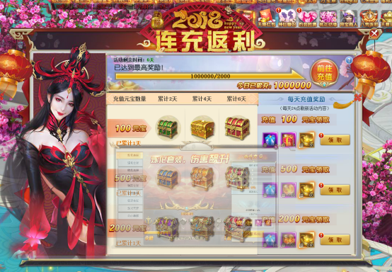 【活动内容】2018,春节狂欢,为了庆祝跨年,活动期间,玩家充值指定金额即可获得充值大奖,累计充值天数与充值元宝数均达到对应的要求,即可领取累计充值奖励。大量绑元、玄武极御材料、斩魄刀礼包、海量装备道具、进阶道具等珍稀道具唾手可得!赶快加入把!