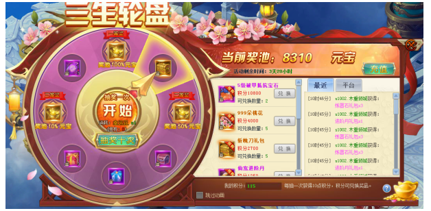 玩家每次转动转盘,都会有5元宝累计作为奖池奖金,每次转盘均有机会获得奖池百分比的奖金及珍贵道具,100%元宝奖金,飞升聚灵材料,斩魄刀礼包,999朵鲜花,法器进阶礼包等你来拿!