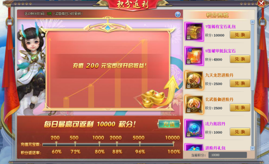 1. 充值满200元宝即可开启积分返利,4小时后返还返利积分;