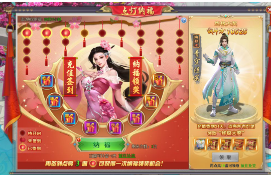 【活动内容】春节临近,点灯纳福。为与众仙友齐庆春节到来,活动期间,仙友每日充值100元宝即可点亮一盏灯笼,点亮指定数量的灯笼即可获得1次纳福领奖机会,纳福必得界面展示奖励之一。点亮全部灯笼除了可领取界面全部奖励外,更有终极大奖免费领取,海量炼器、坐骑、法器、灵宠材料,绝版时装,等你来拿!让我们共同期待新春的到来!