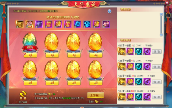 【活动内容】活动期间,玩家可以在活动界面砸金蛋,赢好礼,各种珍贵道具收纳囊中!更有机会砸到七彩金蛋,获取神秘好礼!各类装备材料海量产出,时不我待,快来参加把!