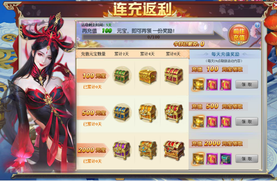 【活动内容】活动期间,玩家充值指定金额即可获得充值大奖,累计充值天数与充值元宝数均达到对应的要求,即可领取累计充值奖励。大量珍稀道具唾手可得!赶快加入把!
