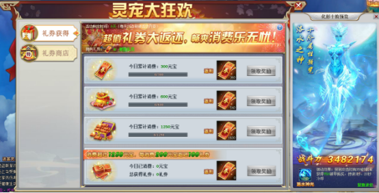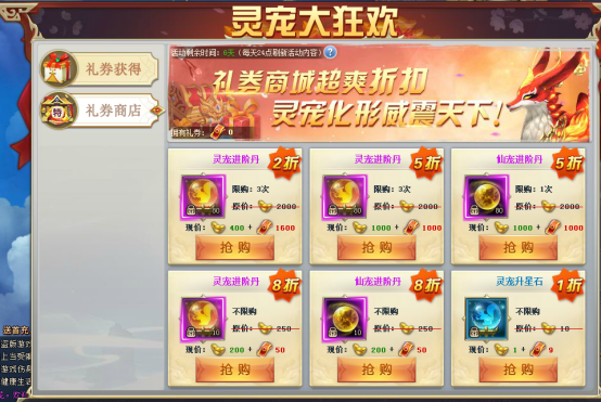 【活动内容】活动期间, 每日累积消费即可享受超值福利,返还超额的海量礼券,随后的消费也可获得高额礼券返还,礼券可用于礼券商店购买高折扣礼包,更有2折礼包在等你,心动不如行动!