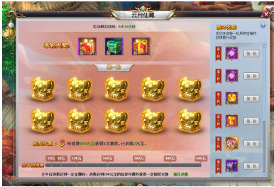 【活动内容】活动期间,玩家消费每200元宝,即可获得1次开启宝箱的机会,全服消费达到指定额度,消费满200元宝的玩家即可获得1次免费的开宝箱机会,完成一轮宝箱开启(开满10次)更有稀有道具赠送,大量灵宠进、法器阶丹在等你!