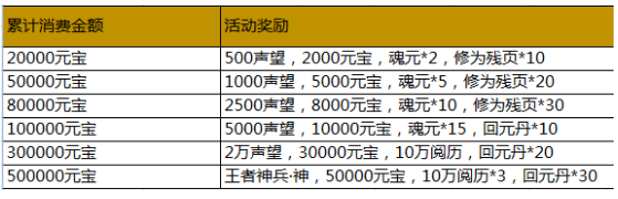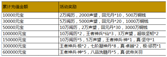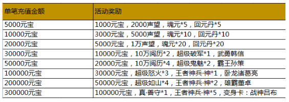 活动内容:活动期间,游戏内充值活动,玩家单笔充值一定金额,即可获得相应的充值奖励。(单笔充值奖励只计算充值元宝最大值,可以单笔重复充值重复领取)