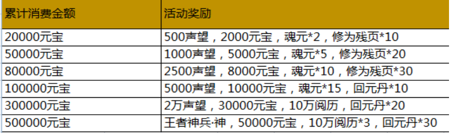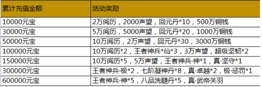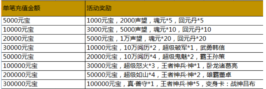 活动内容:活动期间,游戏内充值活动,玩家单笔充值一定金额,即可获得相应的充值奖励。(单笔充值奖励只计算充值元宝最大值,可以单笔重复充值重复领取)