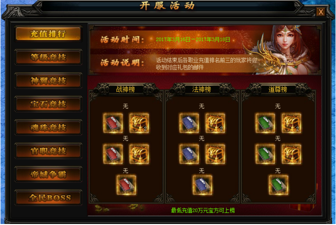 活动内容:开服活动前三天,各职业充值排名前三名的玩家可获得充值大礼,奖励以邮件的形式发放