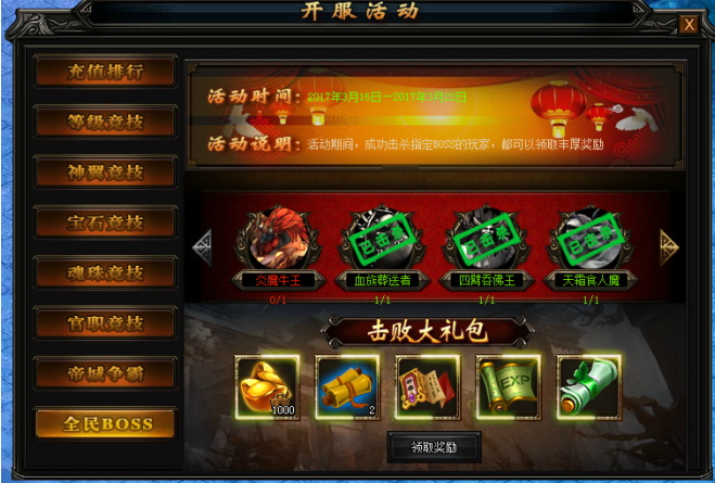 活动内容:开服活动期间,成功击杀指定boss的玩家,都可以领取丰厚奖励