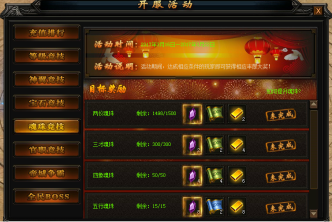 活动内容:开服活动期间,人物魂珠升级至指定等级,即可领取对应等级的奖励