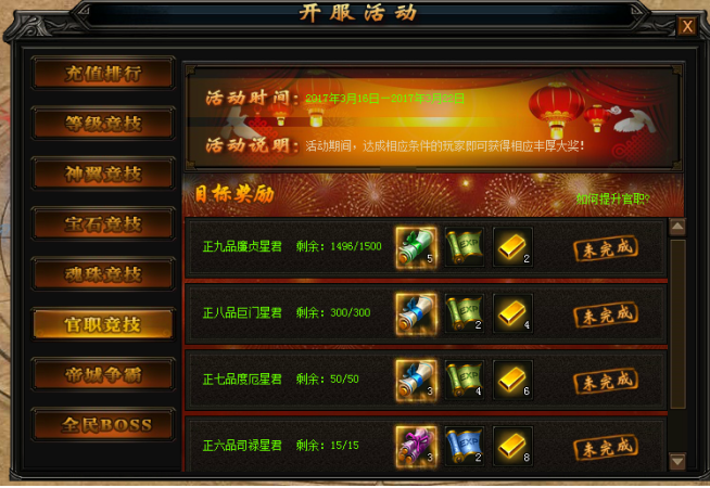 活动内容:开服活动期间,人物官升级至指定等级,即可领取对应等级的奖励
